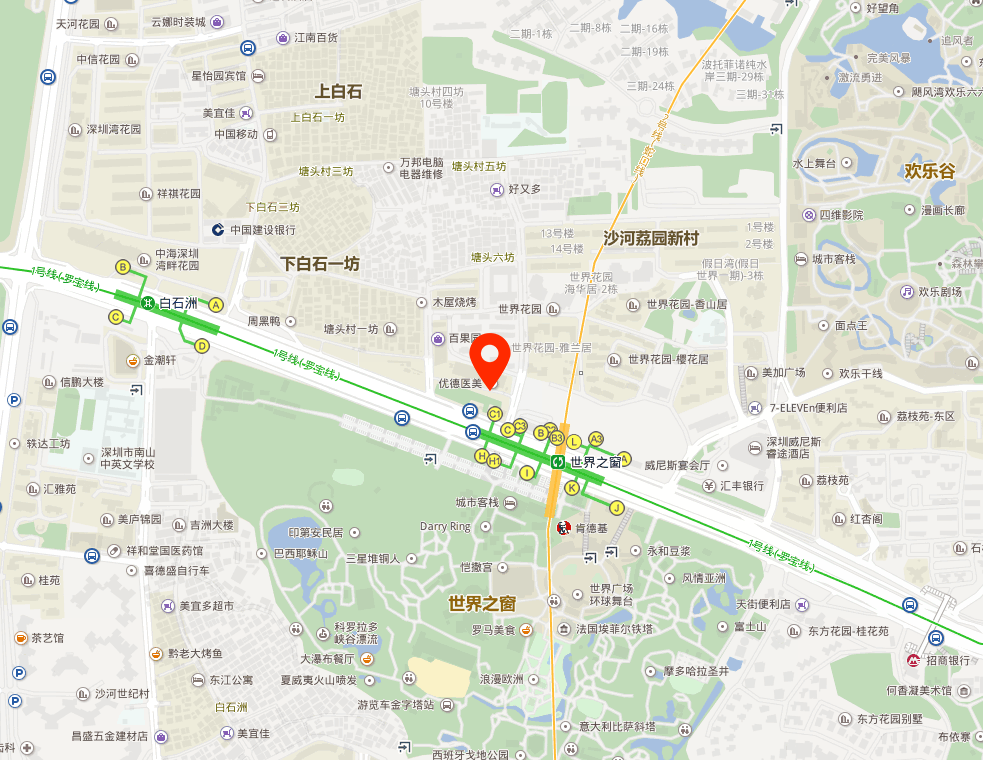 附近的地铁站: 距离地铁1、2(8)号线的换乘站--世界之窗站约177米 附近的公交站: 世界之窗地铁公交接驳站 - 公交站74米; 途经公交车: 43路 320路 392路 M535路 高峰专线36号 世界之窗① - 公交站127米; 途经公交车: 21路 26路 42路 66路 90路 101路 113路 223路 392路 395路 M312路 M486路 M487路 N4路 N90线 定制巴士1653号 高峰专线3号 观光巴士橙线 观光巴士科技生态蓝线 世界之窗② - 公交站159米; 途经公交车: 323路 324路 369路 395路大站快车 M191路 M194路 M413路 M435路 M448路 世界之窗① - 公交站251米; 途经公交车: 21路 26路 42路 90路 101路 113路 223路 M191路 M312路 M486路 M487路 N4路 N90线 高峰专线3号 白石洲② - 公交站437米; 途经公交车: 21路 90路 101路 113路 223路 320路 323路 324路 328路 369路 395路 M191路 M194路 M312路 M413路 M448路 M486路 M487路 N4路 N90线 东站春运专线1号 欢乐谷 - 公交站516米; 途经公交车: M268路 M486路 世界之窗总站 - 公交站353米; 途经公交车: 42路 90路 222路 M268路 M312路 N6路 N90线 美庐锦园 - 公交站686米; 途经公交车: 90路 M486路 M561路 白石洲③ - 公交站686米; 途经公交车: 26路 42路 43路 66路 392路 M312路 M435路 M486路 M535路 高峰专线36号 高峰专线3号